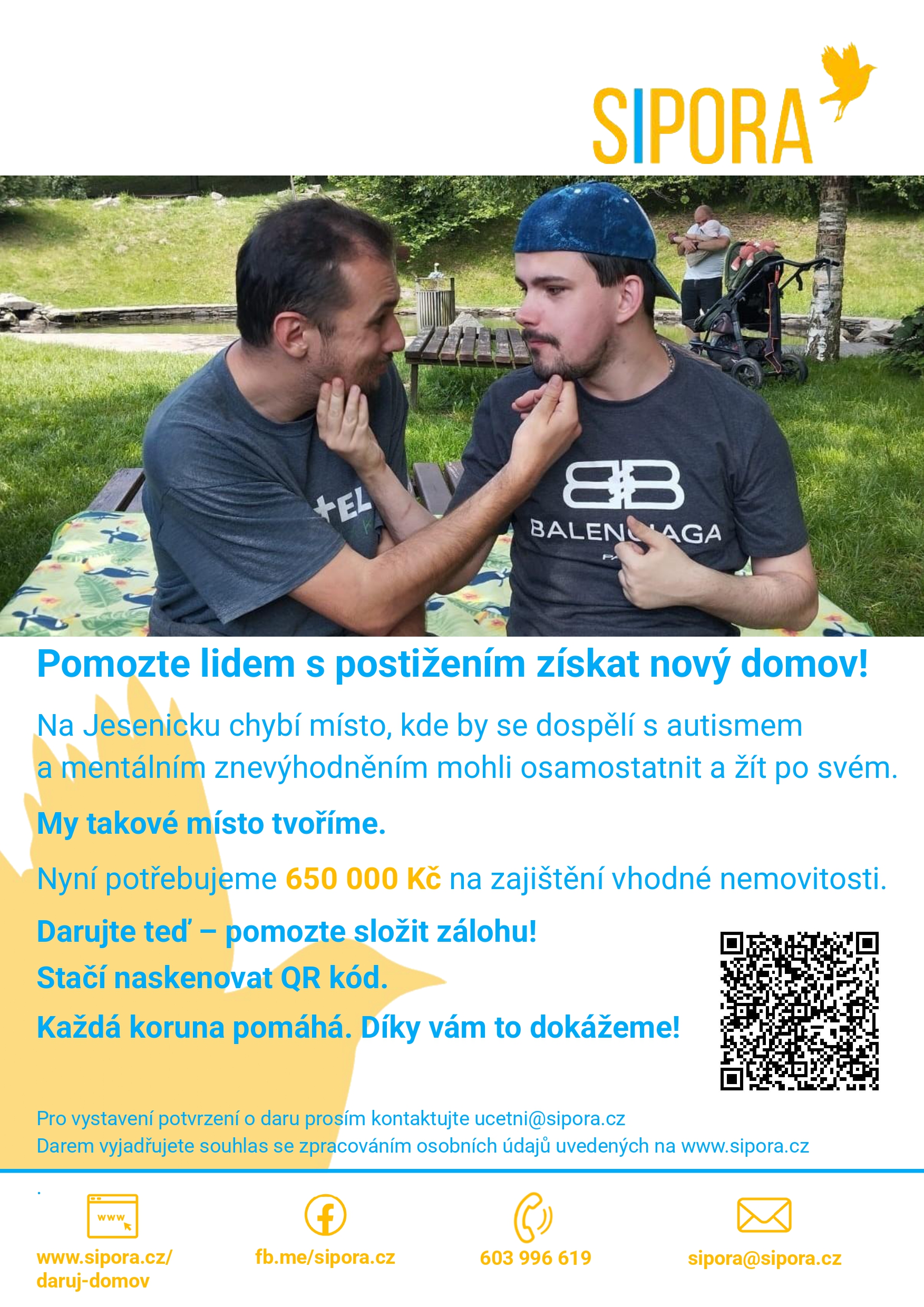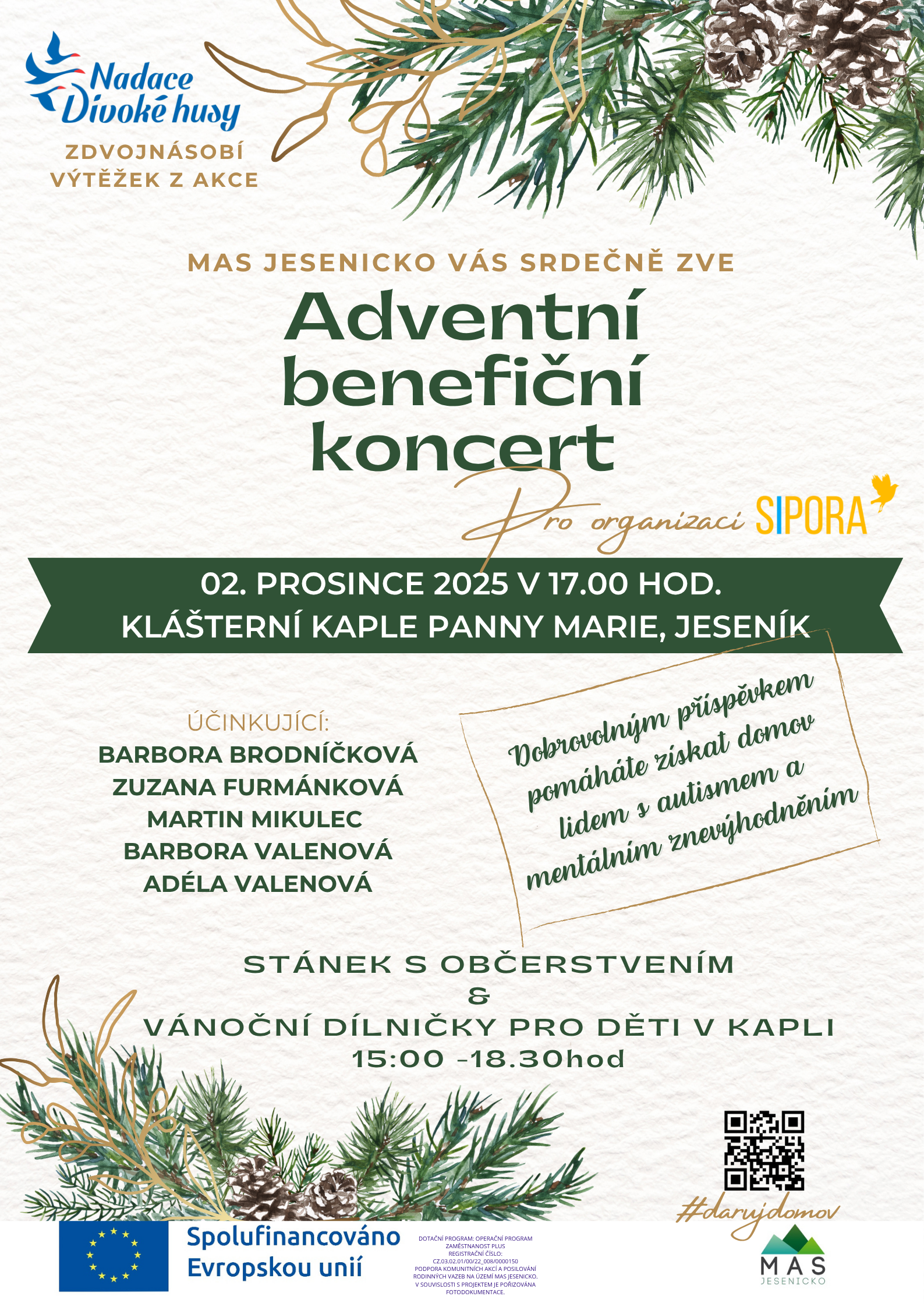 dovolujeme si Vás jménem MAS Jesenicko srdečně pozvat na Adventní benefiční koncert, který pořádáme na podporu neziskové organizace SIPORA. Ta v našem regionu buduje domov pro dospělé osoby s autismem a mentálním znevýhodněním – projekt, který si zaslouží naši pozornost i podporu.